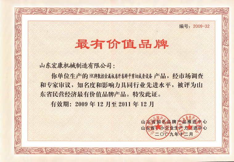 由于我公司在依靠科技进步促进生产力发展,依靠导入先进技术和管理理念提升竞争力方面成效显著,2009年12月,经专家评审,山东省科技成果转化推进中心、山东省中小企业生产力促进中心联合授予我公司“2009年度生产力促进奖”,授予公司“宏康牌数控金属板卷开卷矫平剪切成套设备”“ 山东省民营经济最有价值品牌产品”荣誉称号。