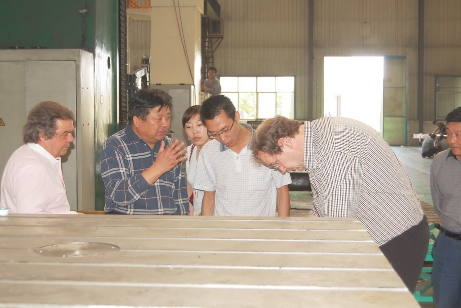 5月20日,荷兰Sepers集团董事长尼克先生一行来公司考察镗铣床生产情况,图为公司董事长、总经理康凤明向外商介绍镗铣床产品。