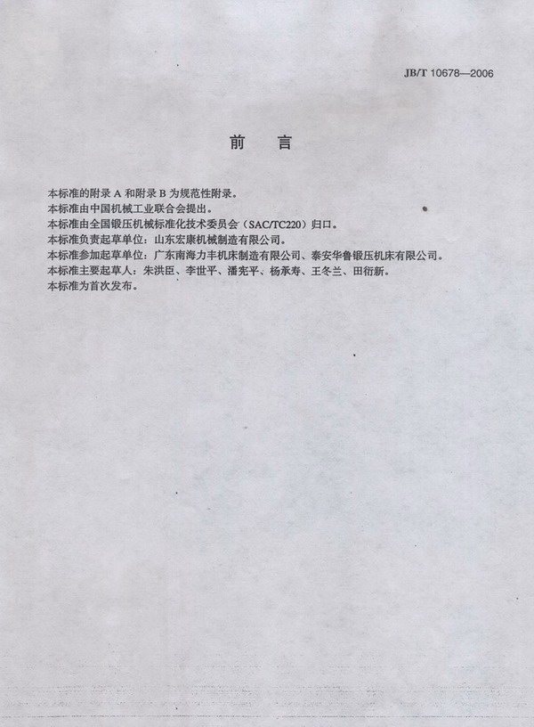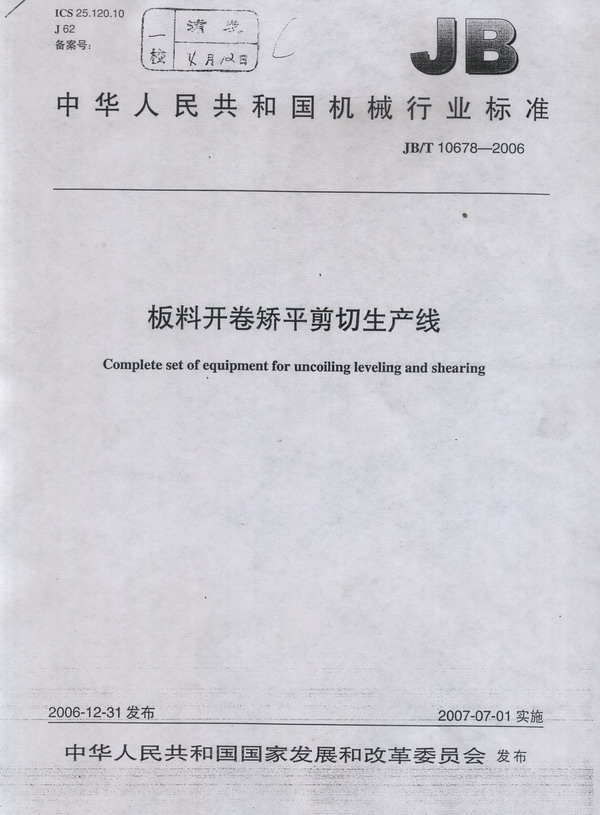 国家发展和改革委员会发出公告(2006年 第 97 号):正式批准由我公司主持起草的“板料开卷矫平剪切生产线”的行业标准(标准号JB /T 10678-2006),并于2007年7月1日实施。 本标准的制订历时十八个月。公司成立了标准制订订工作小组,调访了国内多家科研单位、同行业、用户,并邀请他们来公司共同参与分析讨论,于2005年6月形成最终报批稿。本标准是国内锻压行业第一部对整条生产线进行规范的标准,其技术水平已达到或超过国外现有标准。