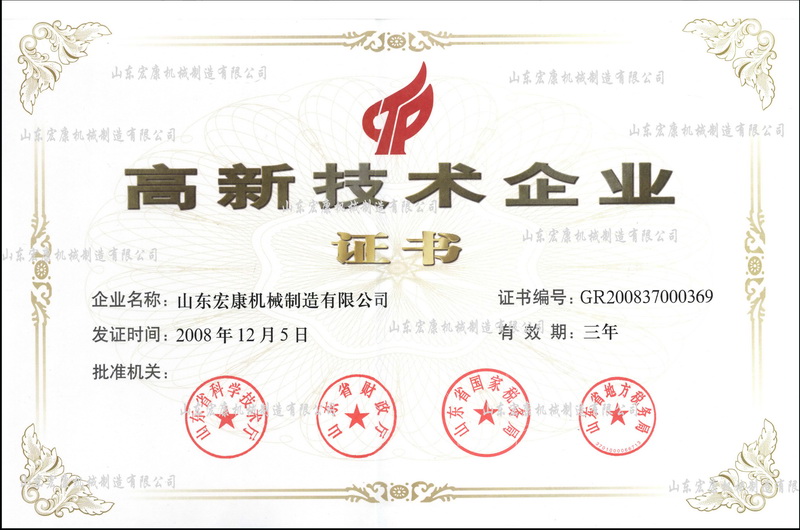 科技部高新技术企业认定管理工作网公示了山东省2008年第一批高新技术企业名单,山东宏康机械制造有限公司公司榜上有名,证书编号:GR200837000369。