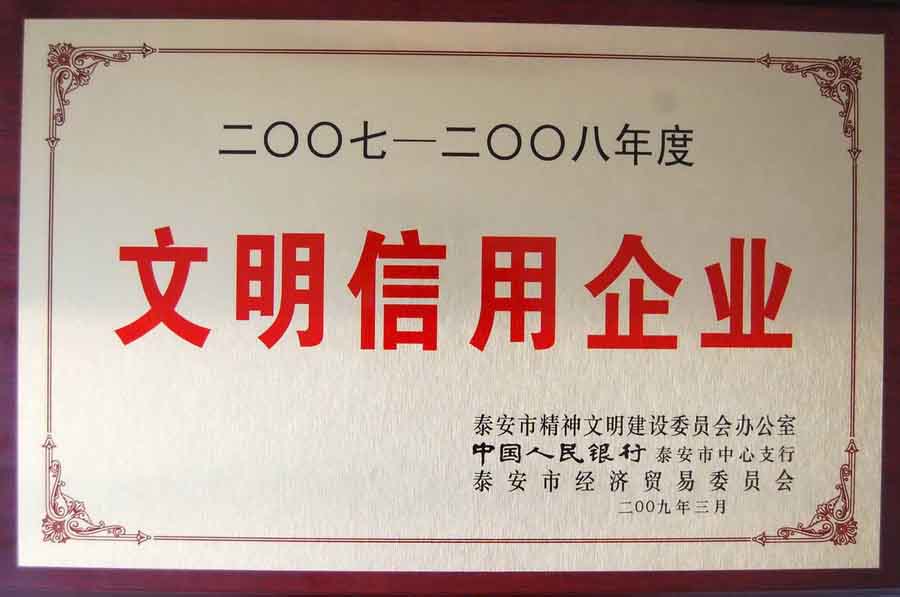 5月14日,泰安市金融生态环境建设推进银企合作会议在泰安东尊华美达大酒店举行,公司副总经理康峰参加会议,并代表公司领取了泰安市精神文明建设委员会办公室、中国人民银行泰安市中心支行、泰安市经济贸易委员会联合授予的2007-2008年度文明信用企业奖牌。