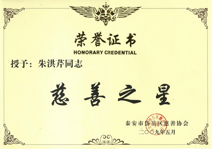 5月22日,在岱岳区召开的“全区慈善工作暨慈善月动员会议”上,公司被授予“最具爱心企业”称号,副董事长朱洪芹被岱岳区慈善协会授予“慈善之星”称号。